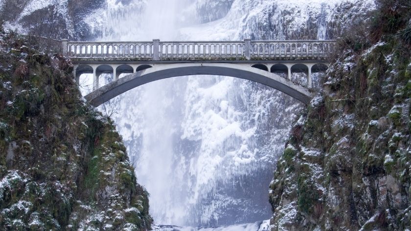A solo 30 millas de Portland, Multnomah Falls es la cascada más alta de Oregón, con 620 pies de caída, y aunque es el sitio recreativo más visitado del estado en otras estaciones, en invierno se transforma en un verdadero winter wonderland para quienes se animan a visitarla bien preparados.